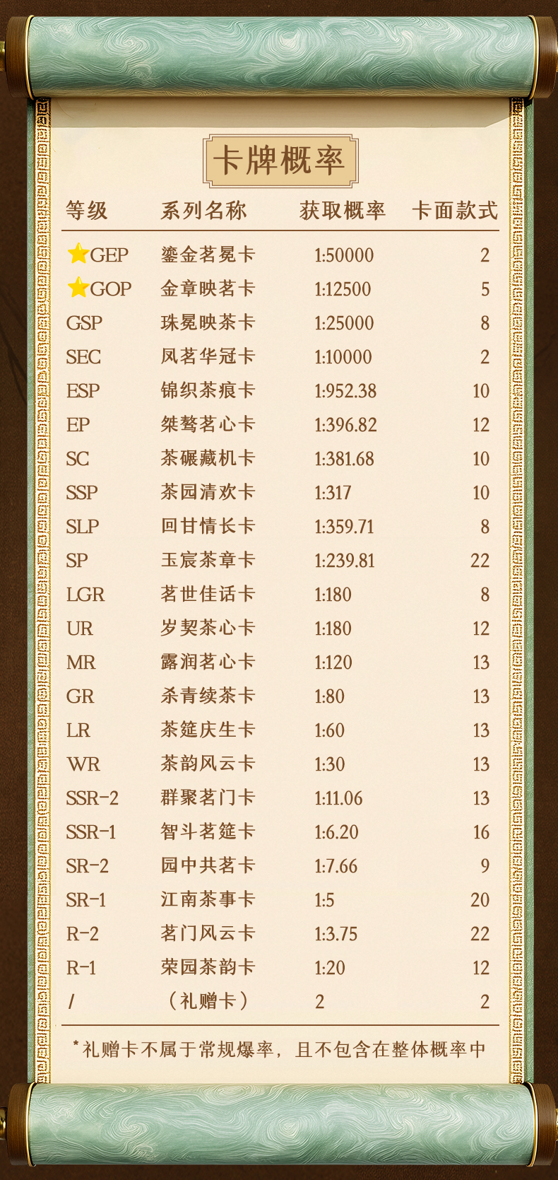Gift redemption cards are bonus items. They do not belong to the standard pull rate pool and are not included in the overall probability calculations.
